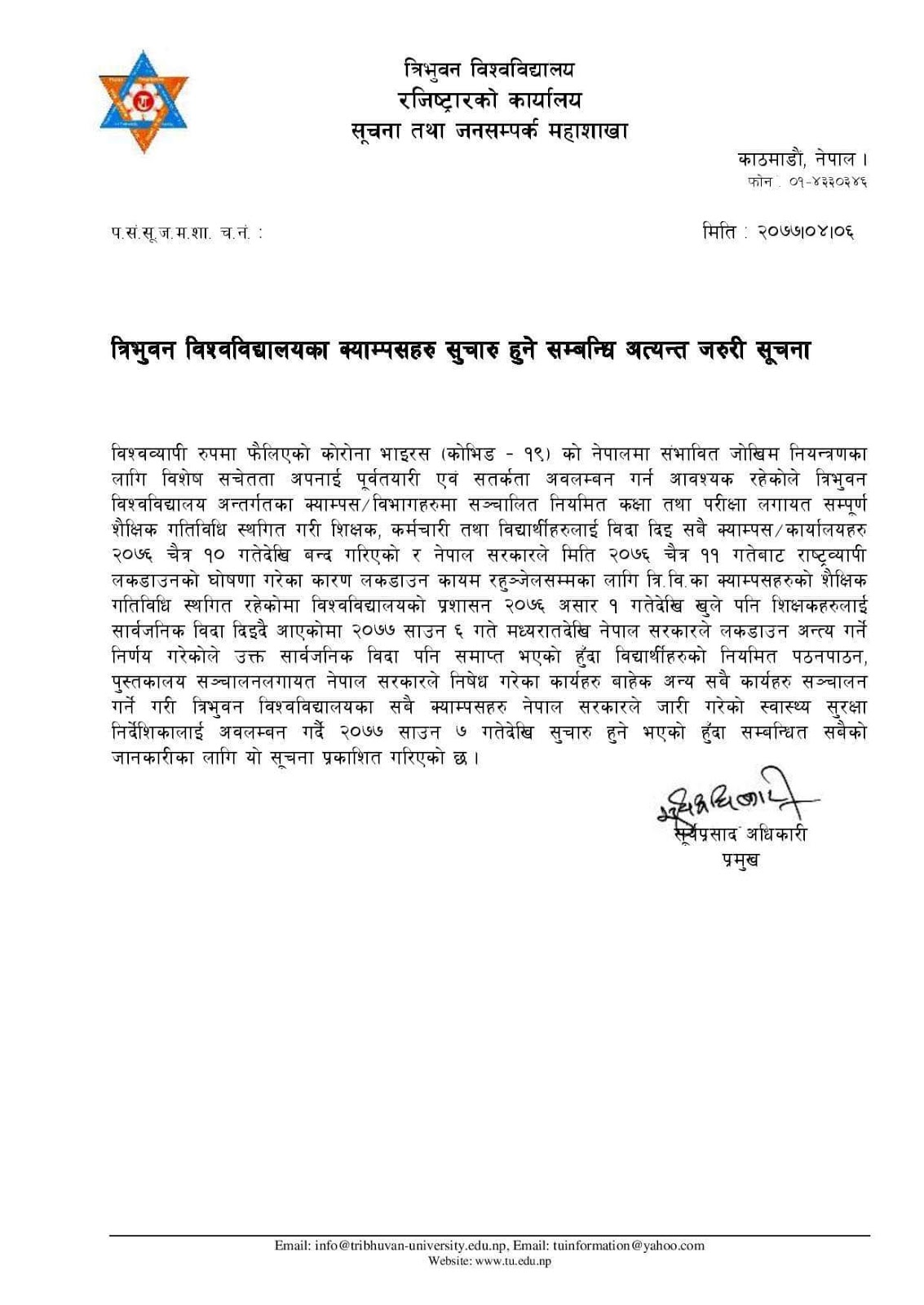 त्रिभुवन विश्वविद्यालयको क्याम्पसहरु सूचारु गर्ने सम्बन्धी अत्यन्त जरुरी सूचना ।